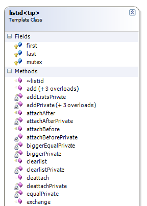 | private : void listid implementeaza practic atasarea unei element generica existent dupa un altul din lista generica; functie privata, care nu implementeaza mutexuri |