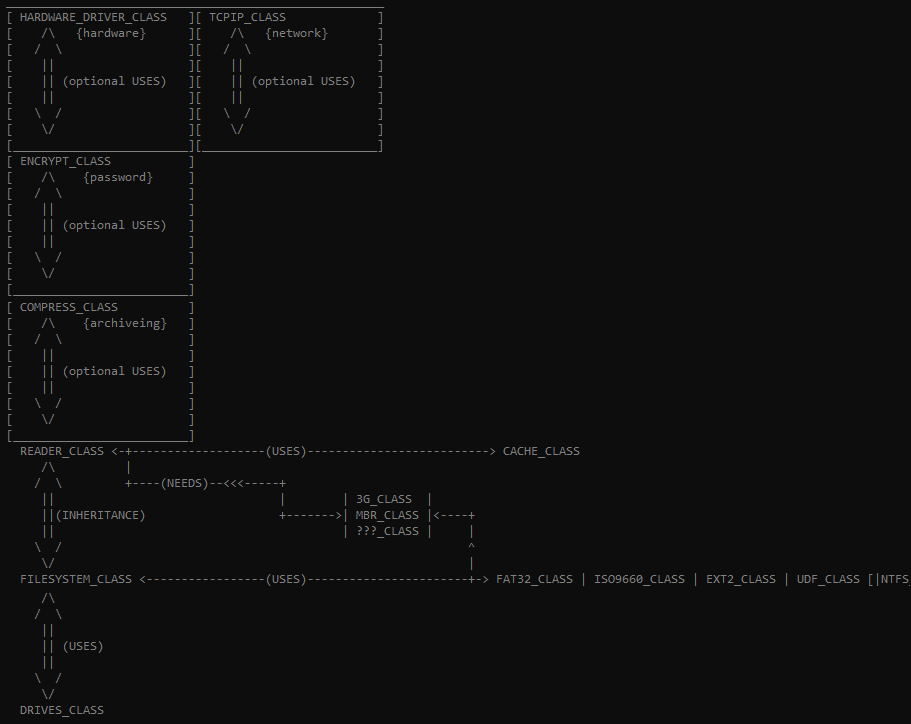 explicitare:-reader_class a. ofera: functii abstracte pt citire/scriere structuri[sectoare]; integrare in/cu driverul de sisteme de fisiere al sistmului de operare gazda b. foloseste: clasa "cache_class" pt cache de structuri c. are nevoie de [mosteneste de la] : fara mosteniri d. optional: poate folosi functiile de citire/scriere structuri[sectoare] oferite de o clasa de drivere de hardware [hardware_driver_class] -cache_class a. ofera: sistem paginat de cache optim de structuri pt sistem I/O de dimesiune mare[<=2TB]/medii[~GB]/mici[sute MB] prin functii abstarcte de citire/scriere structuri b. foloseste: clasa "reader_class" ca clasa de interfata pt citire directa de structuri[sectoare] c. are nevoie de [mosteneste de la] : fara mosteniri -filesystem_class a. ofera: un de integrare a stucturilor[sectoarelor]; pointerii la functii standard de fisiere [creare,stergere,citire,scriere] b. foloseste: clase de interfata cu tipuri de aranjare/traducere a structurilor: clasa fat32_class, clasa iso9660_class, clasa ext2_class etc... c. are nevoie de [mosteneste de la] : clasa "reader_class" d. permite neglijarea : lungimea unei structuri[sector], modul de aranjarea a structurilor -drives_class a. ofera: un sistem de integrare a mai multor clase "filesystem_class" si a unor interfete ce permit transferul de date intre doua sau mai multe clase "filesystem_class" [copyfile,recursivecopy,etc] b. foloseste: clasa "filesystem_class" c. are nevoie de [mosteneste de la] : fara mosteniri d. permite neglijarea : folosirii unui singur tip de sistem de fisiere; neglijeaza stuctura sistemelor de fisire -fat32_class / iso9660_class / etc2_class / ... etc a. ofera: functii publice pt manipulare fisiere/directoare (creeare,stergere,citire,scriere,cautare) specifice sistemului de fisiere selectat [fat32/iso/ext/...] b. foloseste: functii (pointeri la) de citire/scriere structuri de date[sectoare]; access optional printr-un adaptor de partitii[MBR_CLASS | 3G_CLASS | ???_CLASS] la o clasa "reader_class" c. are nevoie de [mosteneste de la] : fara mosteniri d. permite neglijarea : altor sisteme de structuri; -mbr_class / 3g_class / ???_class etc a. ofera: discernere intre tipuri de partii; enumera partitiile valide inclusiv partitiile extinse; selector de partitii b. foloseste: reader_class c. are nevoie de [mosteneste de la] : fara mosteniri -[optional] hardware_driver_class a. ofera: functii pt citire/scriere structuri specifice[sectoare] b. foloseste: access direct la anumite componente hardware, alte clase hardware_driver [ca de pilda un driver de ATA/IDE va folosi o clasa DMA,PCI_BUS,INTERRUPTS,...] c. are nevoie de [mosteneste de la] : depinde d. permite neglijarea : claselor de nivel superior (neglijarea drives_class, filesystem_class, etc...) se pot implementa si alte clase cu aplicatii specifice : de pilda: - clasa "check_disk_class" pt verificat corectitudinea datelor, incadrarea in constrangeri [clasa ce va folosi drives_class/filesystem_class sau direct reader_class] - clasa "drive_commander_class" o interfate IDE de navigare prin foldere/fisire [gen NC,MC,DC...] [clasa ce va folosi drives_class] - clasa "disk_defragment_or_chrunk_class" pt defragmentarea anumitor tipuri de sisteme de fisiere sau pt COMPACTAREA datelor din anumite tipuri de fisirer [clasa va folosit filesystem_class] - clasa "disk_editor_class" pt acesarea/editarea/recuperarea avansata de structuri interne ale unui anumit tip de sistem de fisier [clasa va folosi "filesystem_class" si "reader_class" si optional si "cache_class"] - clasa "virtual_driver_class" pt creare de interfere virtuale de drivere prin care se pot monta imagini de sisteme... sau cu alte scopuri[o interfata care citeste secventiale de la un port USB de pilda] - clasa "tcpip_class" pt acesarea de la distanta prin intermediul (internetului)/(retelei locala) a unui sistem de fisiere folosind protocolul TCP/IP - clasa "p2p_class" pt folosirea unei conexiuni de tip peer2peer (acelasi sistem folosit pt torrente, sistem folosit in unitatile militare/politie etc ...] - clasa "encript_class" pt folosirea encriptarii/decriptarii de structuri[sectoare] - clasa "compress_class" pt comprimarea(arhivarea) de structuri [sectoare] */ //---------------------------------------------------------------------------------------------- |