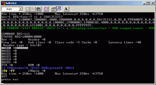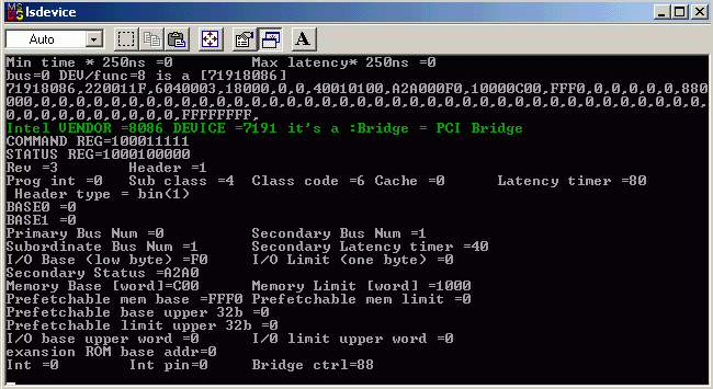 | LSdevice is a tool to query information about your hardware and about main chips on a pc board ... It displays info about PCI32 BIOS, PIC, PIT, DMA and all the PCI devices on your PC (using PCI port or PCI32 BIOS proc). Also if you have an OHCI USB chip you can view some additional information about it.... The best place to run is under FreeDOS or MSDOS ! (it works with Linux too).